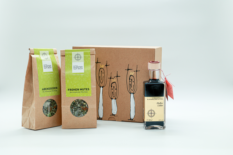 "GENUSSPAKETE" FÜR PRIVATE UND FIRMEN PERSÖNLICH, STILVOLL, INKLUSIV UND INDIVIDUELL Schenken Sie Herzenswärme, inneren Frieden, Beziehung und handverlesene LEBENS-MITTEL aus dem Europakloster Gut Aich in St. Gilgen am Wolfgangsee! Was macht unsere Pakete so besonders? Jedes Paket, das wir liefern dürfen, unterstützt „enthindert kreativ“ mit € 2,50 Inhalt: 1x Bio Abendsegen Tee 1x Bio Frohen Mutes Tee 1x Holler Kräuterlikör 0,2l Handgefertigte Produkte aus dem Europakloster Gut Aich in einer Verpackung von Künstler*innen mit Einschränkungen. Gemeinsam mit „enthindert kreativ“ setzen wir ein starkes Zeichen für Inklusion, Teilhabe und gelebte Kreativität - enthindert-kreativ.at In Beziehung kommen und bleiben ... mit uns selbst, unseren Mitmenschen und unserer Erde!