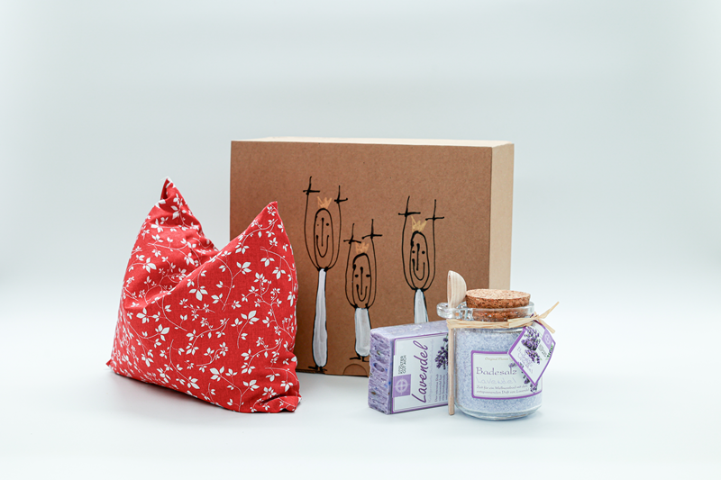 "GENUSSPAKETE" FÜR PRIVATE UND FIRMEN PERSÖNLICH, STILVOLL, INKLUSIV UND INDIVIDUELL Schenken Sie Herzenswärme, inneren Frieden, Beziehung und handverlesene LEBENS-MITTEL aus dem Europakloster Gut Aich in St. Gilgen am Wolfgangsee! Was macht unsere Pakete so besonders? Jedes Paket, das wir liefern dürfen, unterstützt „enthindert kreativ“ mit € 2,50 Inhalt: 1x Badesalz Lavendel mit Hiolzlöffel 1x Kräuterkissen 1x Lavendel Seife Handgefertigte Produkte aus dem Europakloster Gut Aich in einer Verpackung von Künstler*innen mit Einschränkungen. Gemeinsam mit „enthindert kreativ“ setzen wir ein starkes Zeichen für Inklusion, Teilhabe und gelebte Kreativität - enthindert-kreativ.at In Beziehung kommen und bleiben ... mit uns selbst, unseren Mitmenschen und unserer Erde!