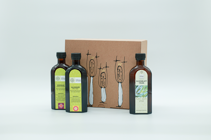 "GENUSSPAKETE" FÜR PRIVATE UND FIRMEN PERSÖNLICH, STILVOLL, INKLUSIV UND INDIVIDUELL Schenken Sie Herzenswärme, inneren Frieden, Beziehung und handverlesene LEBENS-MITTEL aus dem Europakloster Gut Aich in St. Gilgen am Wolfgangsee! Was macht unsere Pakete so besonders? Jedes Paket, das wir liefern dürfen, unterstützt „enthindert kreativ“ mit € 2,50 Inhalt: 1x Vissenium "Kraft im Alter" 1x Salvamaro "Bitersegen" 1x Olivenblatt Trunk "Fühl Dich Wohl" Handgefertigte Produkte aus dem Europakloster Gut Aich in einer Verpackung von Künstler*innen mit Einschränkungen. Gemeinsam mit „enthindert kreativ“ setzen wir ein starkes Zeichen für Inklusion, Teilhabe und gelebte Kreativität - enthindert-kreativ.at In Beziehung kommen und bleiben ... mit uns selbst, unseren Mitmenschen und unserer Erde!