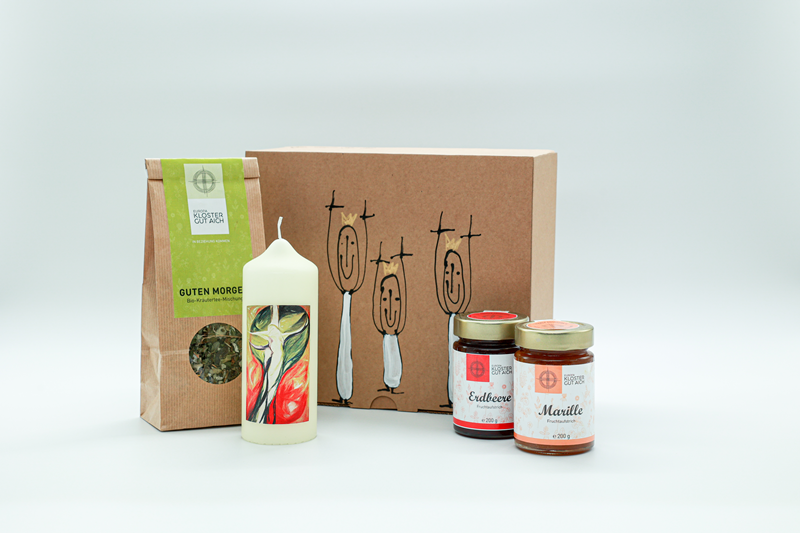 "GENUSSPAKETE" FÜR PRIVATE UND FIRMEN PERSÖNLICH, STILVOLL, INKLUSIV UND INDIVIDUELL Schenken Sie Herzenswärme, inneren Frieden, Beziehung und handverlesene LEBENS-MITTEL aus dem Europakloster Gut Aich in St. Gilgen am Wolfgangsee! Was macht unsere Pakete so besonders? Jedes Paket, das wir liefern dürfen, unterstützt „enthindert kreativ“ mit € 2,50 Inhalt: 1x Marillenmarmelade 1x Erdbeer Marmelade 1x Bio Guten Morgen Tee 1x Kerze Lebensbaum v. Prior Thomas Hessler Handgefertigte Produkte aus dem Europakloster Gut Aich in einer Verpackung von Künstler*innen mit Einschränkungen. Gemeinsam mit „enthindert kreativ“ setzen wir ein starkes Zeichen für Inklusion, Teilhabe und gelebte Kreativität - enthindert-kreativ.at In Beziehung kommen und bleiben ... mit uns selbst, unseren Mitmenschen und unserer Erde!