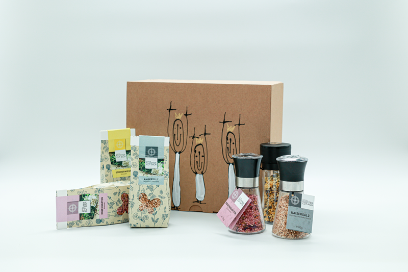 "GENUSSPAKETE" FÜR PRIVATE UND FIRMEN PERSÖNLICH, STILVOLL, INKLUSIV UND INDIVIDUELL Schenken Sie Herzenswärme, inneren Frieden, Beziehung und handverlesene LEBENS-MITTEL aus dem Europakloster Gut Aich in St. Gilgen am Wolfgangsee! Was macht unsere Pakete so besonders? Jedes Paket, das wir liefern dürfen, unterstützt „enthindert kreativ“ mit € 2,50 Inhalt: 1x Rosengartensalz Mühle 1x Kaisersalz Mühle 1x Sommerweisesalz Mühle 1x Rosengartensalz Nachfüllpackung im Graspapier 1x Kaisersalz Nachfüllpackung im Graspapier 1x Sommerwiese Salz Nachfüllpackung im Graspapier Handgefertigte Produkte aus dem Europakloster Gut Aich in einer Verpackung von Künstler*innen mit Einschränkungen. Gemeinsam mit „enthindert kreativ“ setzen wir ein starkes Zeichen für Inklusion, Teilhabe und gelebte Kreativität - enthindert-kreativ.at In Beziehung kommen und bleiben ... mit uns selbst, unseren Mitmenschen und unserer Erde!